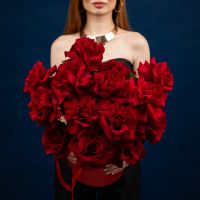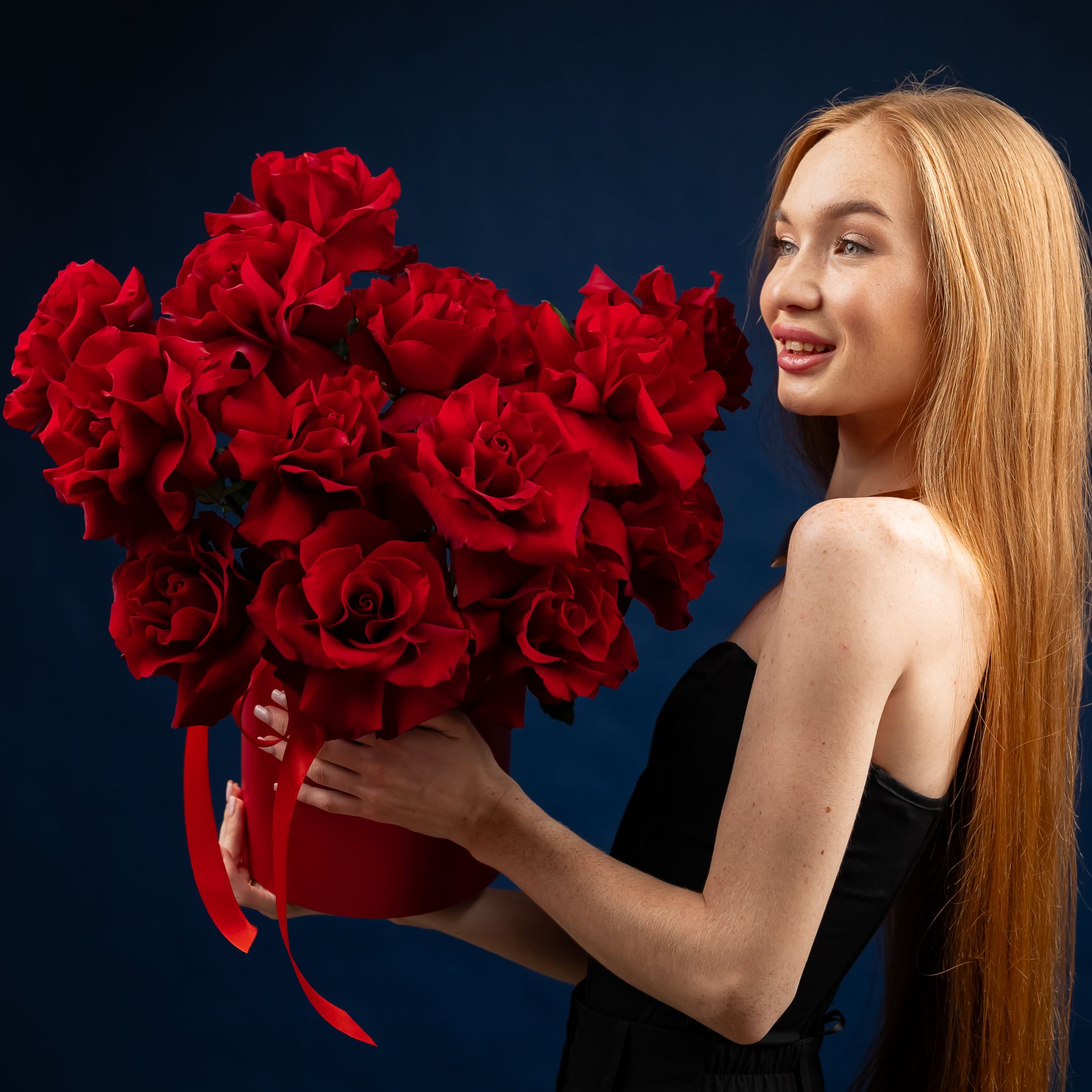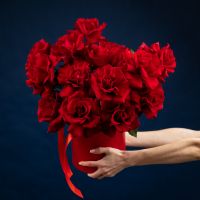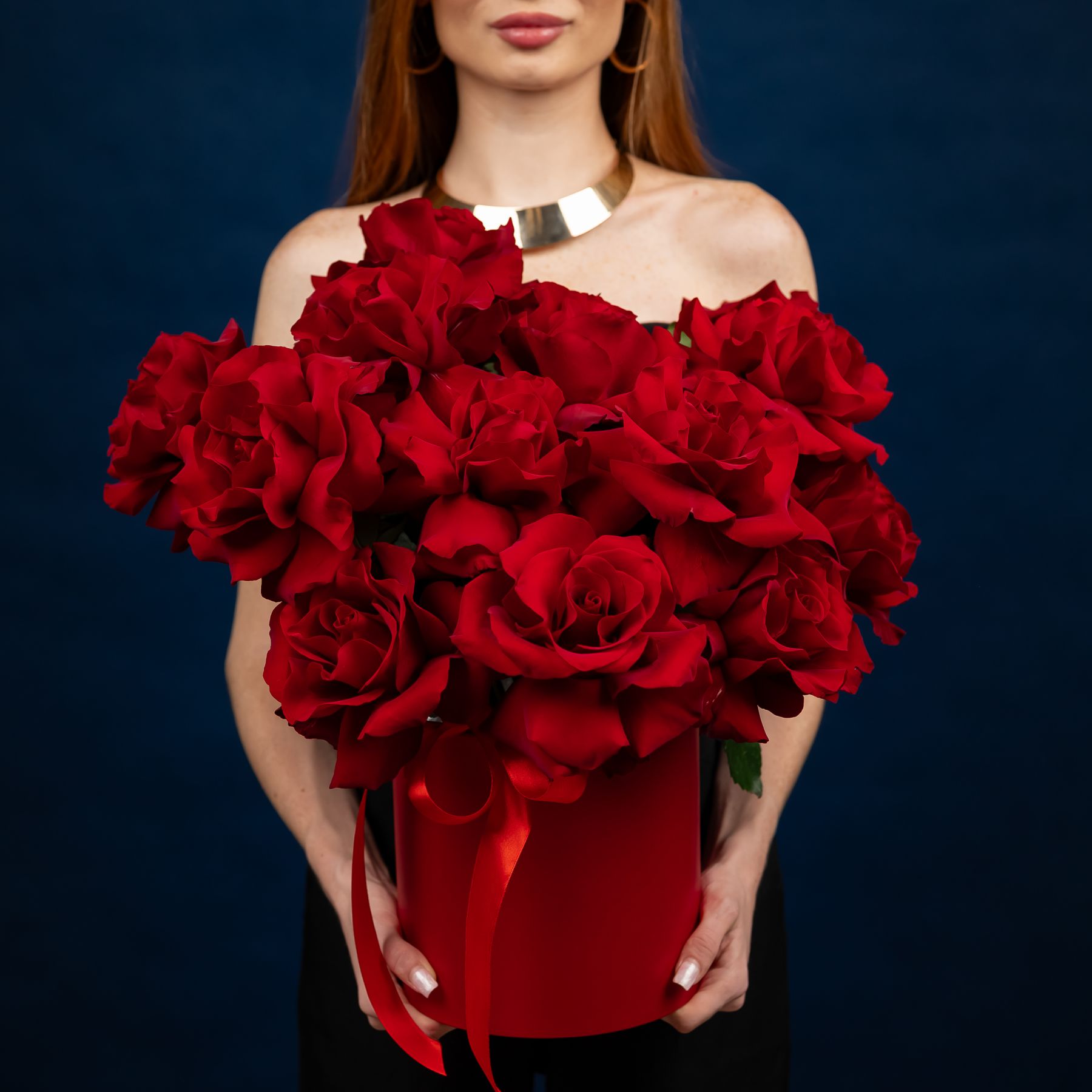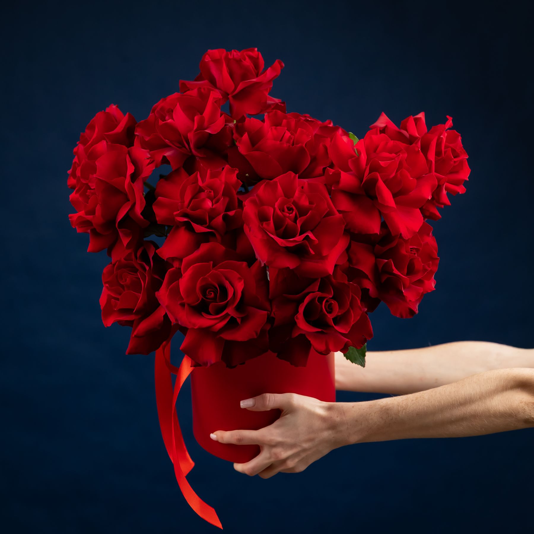 15 французских роз в шляпной коробке (сорт Мондиаль)