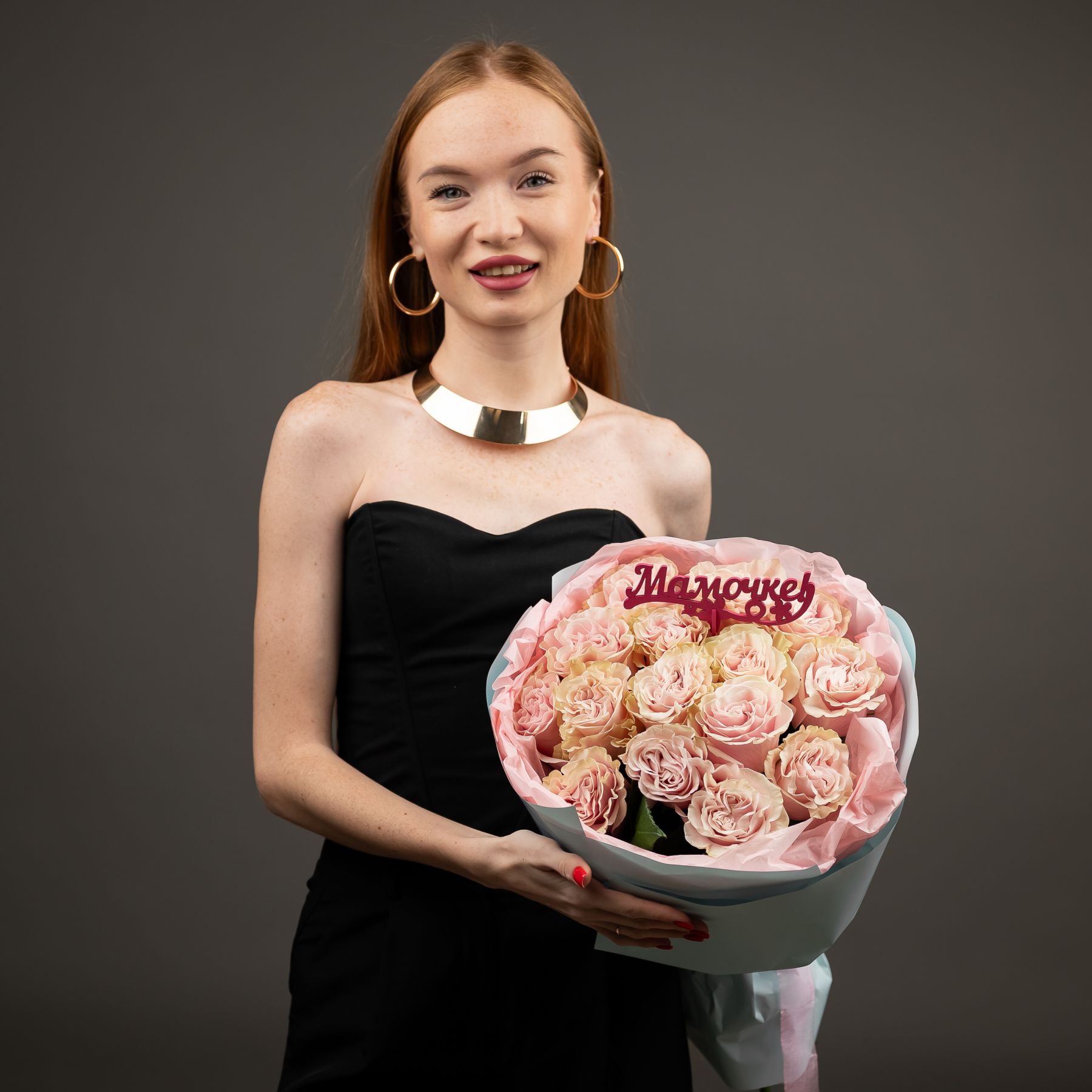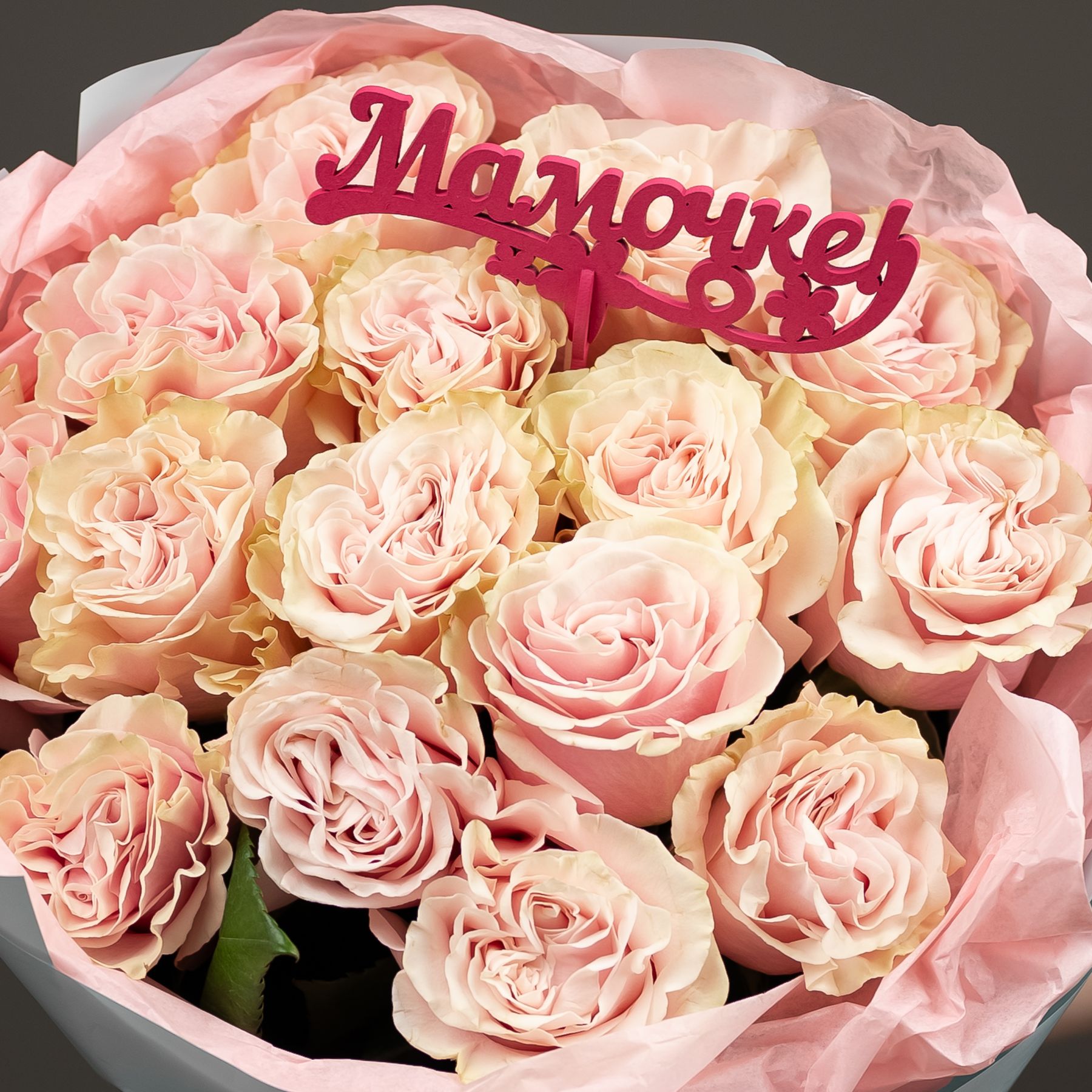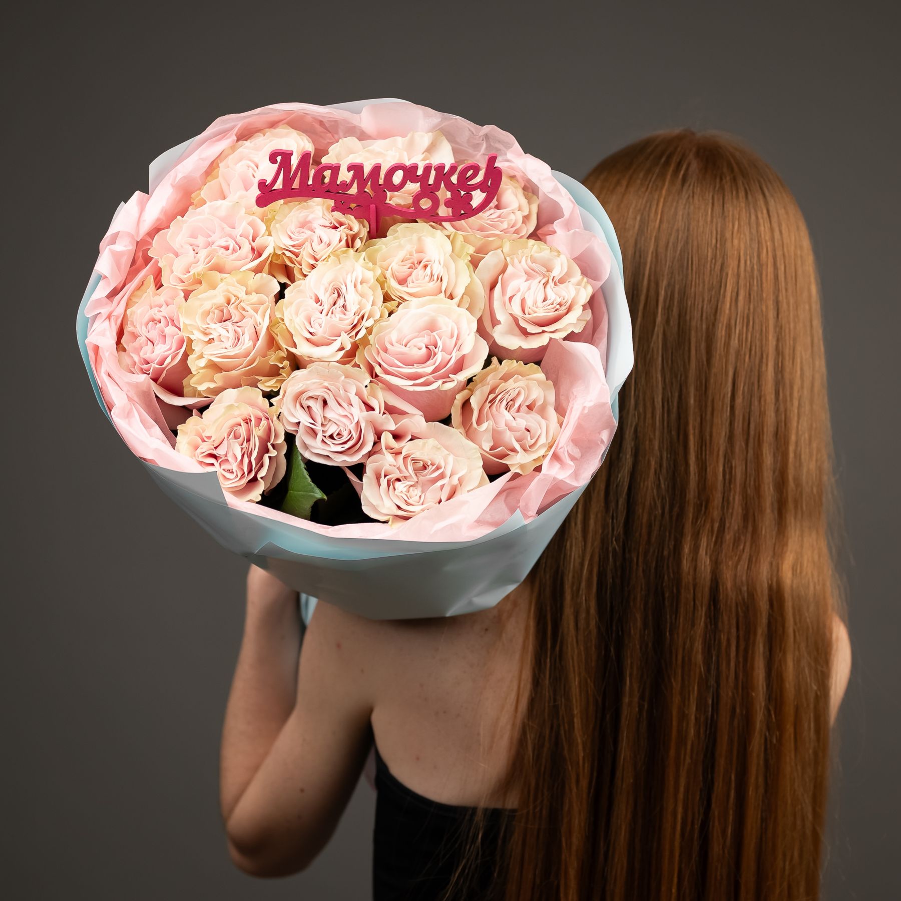 Роза розовая 15 шт (пинк подиаль) + топпер "Маме"