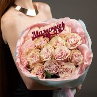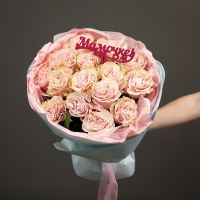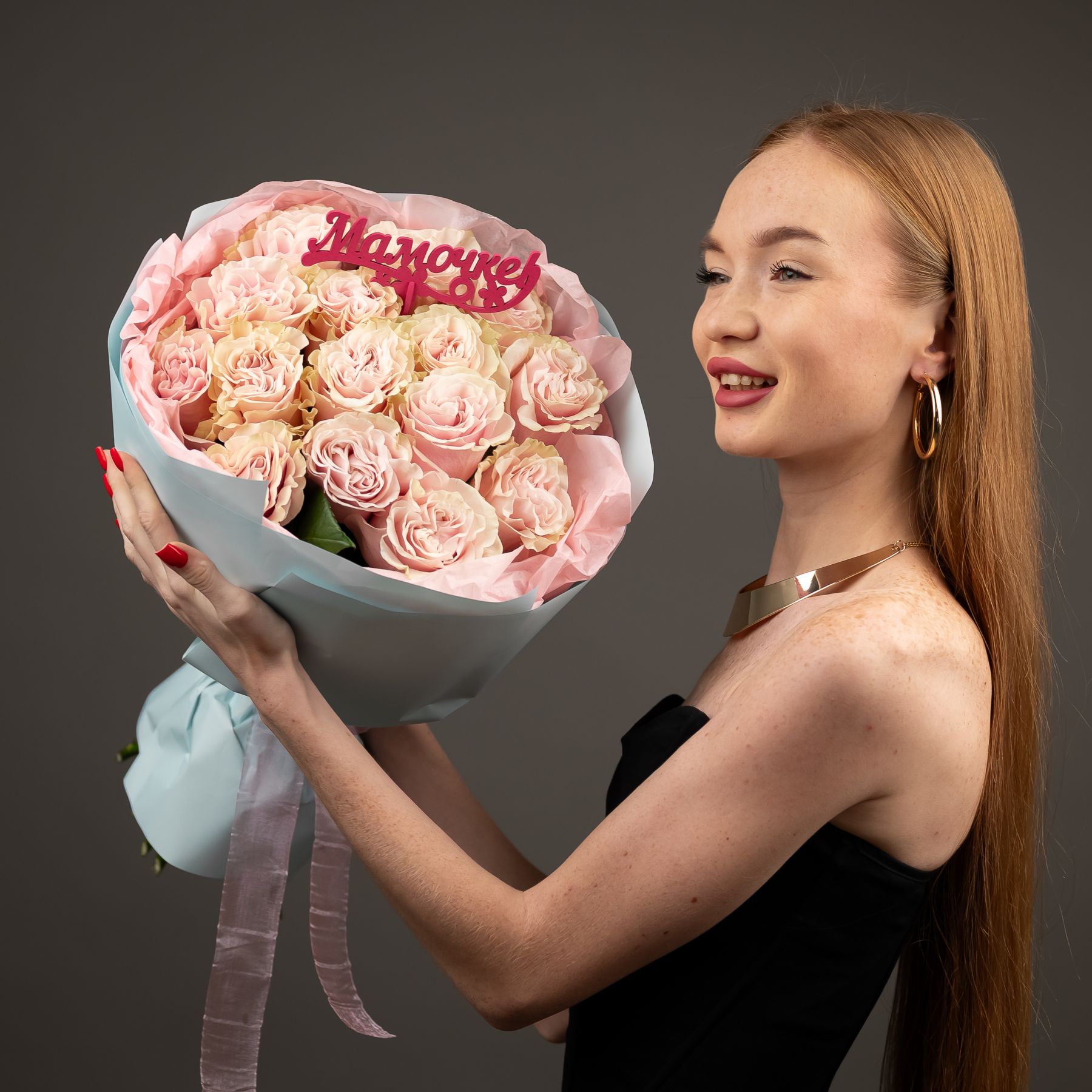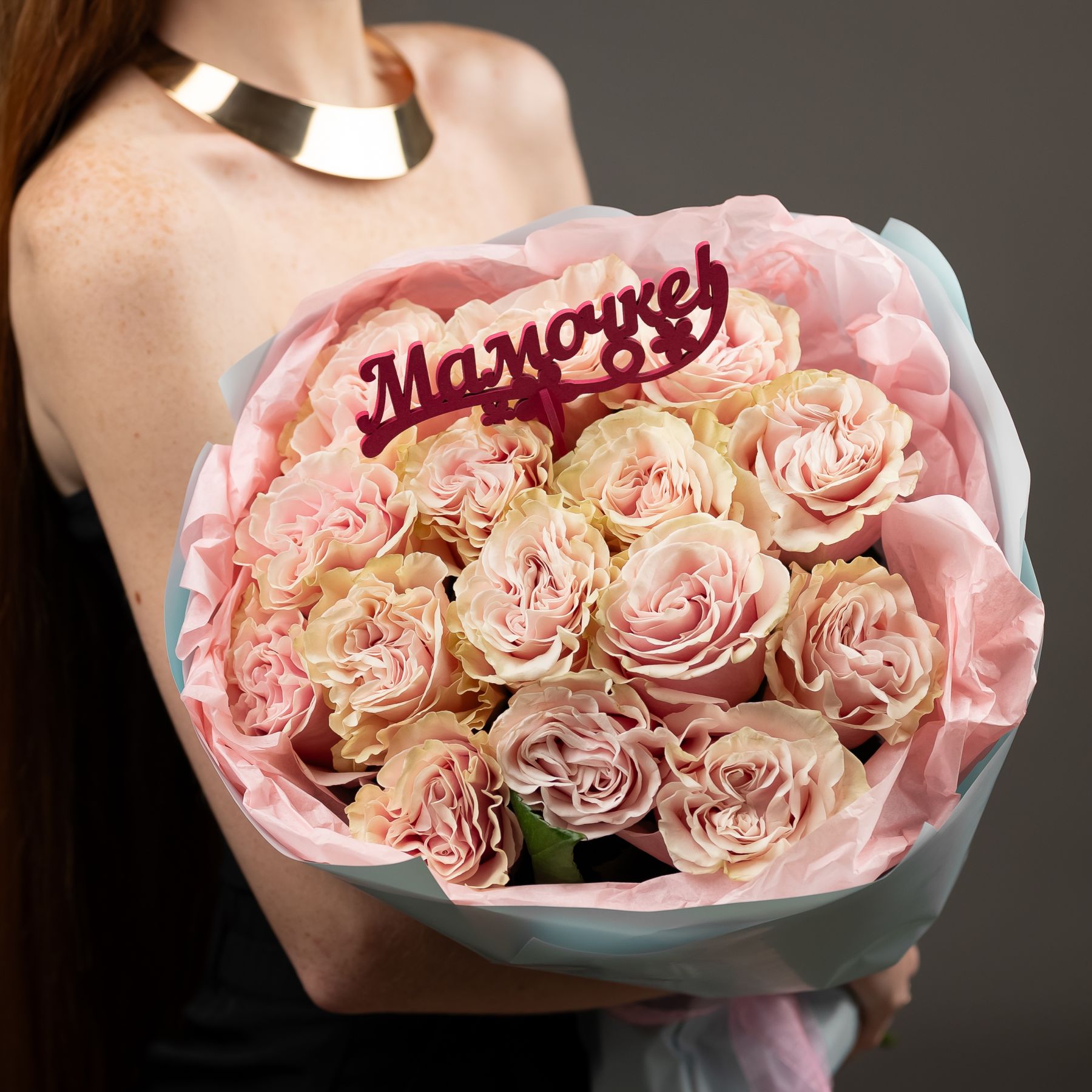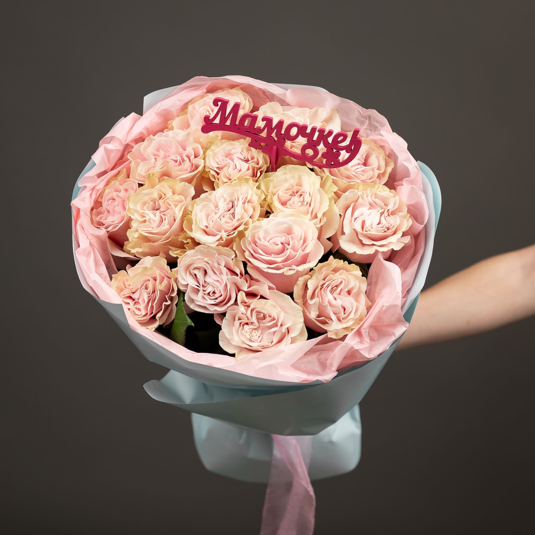 Роза розовая 15 шт (пинк подиаль) + топпер "Маме"